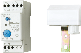 FINDER 11 SERIE - SCHEMERINGSSCHAKELAARS 0224-850552 06-52634163 Schemeringsschakelaars voor automatische besturing van verlichting afhankelijk van het omgevingslicht - met separate fotosensor 11.31 - 1 maakcontact 16 A • Hysteresis (Uit/Aan verhouding 1,25:1) • Gevoeligheidsinstelling van 1 tot 100 lux • Laag energieverbruik • Versie beschikbaar voeding 24 V DC/AC 11.41 - 1 wisselcontact 16 A • Europees patent gepatenteerde “Nul-hysteresis” voor energiebesparing • Italiaanse patent - Principe dat beïnvloeding door de geschakelde verlichting onderdrukt • Keuzeschakelaar met 4 standen: - Standaard bereik (drempelinstelling 1...80 lx) - Hoog bereik (drempelinstelling 30...1.000 lx) - Continu verlichting (nuttig bij installatie, testen en onderhoud) - Verlichting uit (tijdens vakantie) • Tijdens de eerste 3 werkingscycli zijn de vertragingstijden (Aan en Uit) teruggebracht tot nul om de installatie te vereenvoudigen • LED-statusindicatie • SELV scheiding tussen contact en voeding • Dubbele isolatie tussen voeding en fotosensor • 35 mm railmontage (EN 60715) • Cadmiumvrij contactmateriaal • Cadmiumvrije fotosensor (IC fotodiode) Specificaties